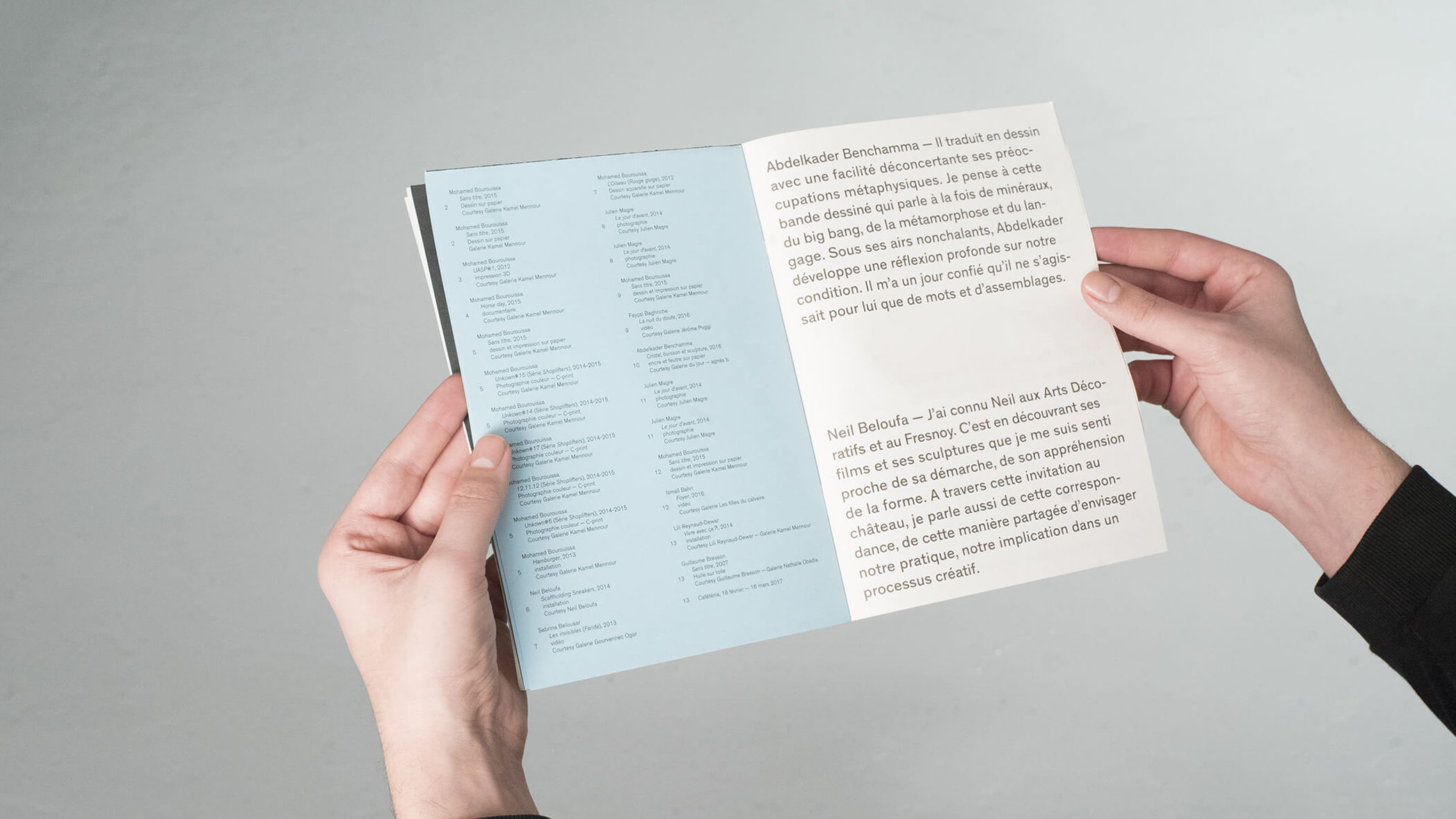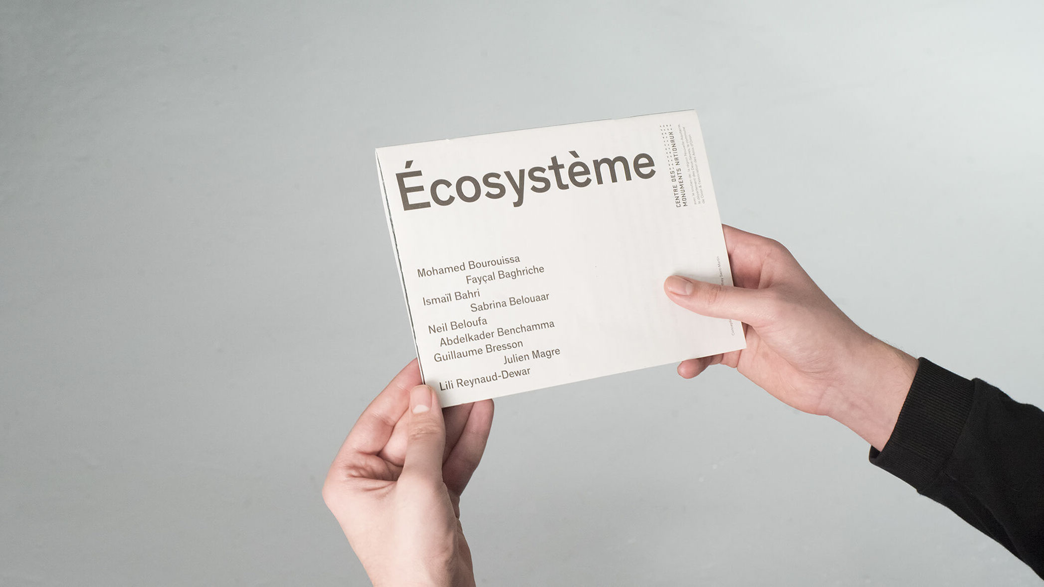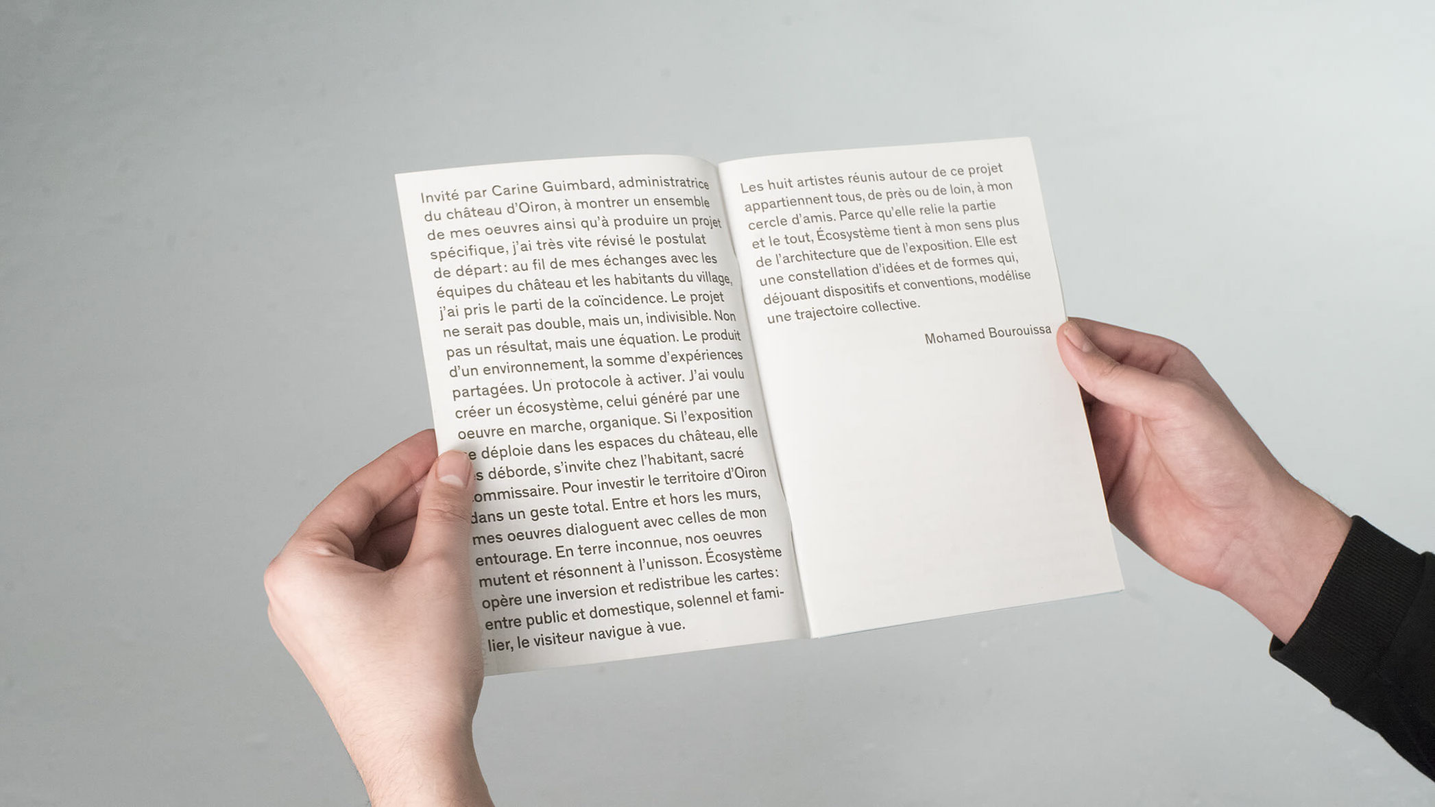 20    Document de visite pour l'exposition Écosystème de Mohamed Bourouissa, organisée par le Château d'Oiron et regroupant des œuvres de Mohamed Bourouissa, Fayçal Baghriche, Ismaïl Bahri, Sabrina Belouaar, Neil Beloufa, Abdelkader Benchamma, Guillaume Bresson, Julien Magre, Lili Reynaud-Dewar, répartie chez les habitants de la ville d'Oiron    offset une couleur    150 × 210 mm    2017