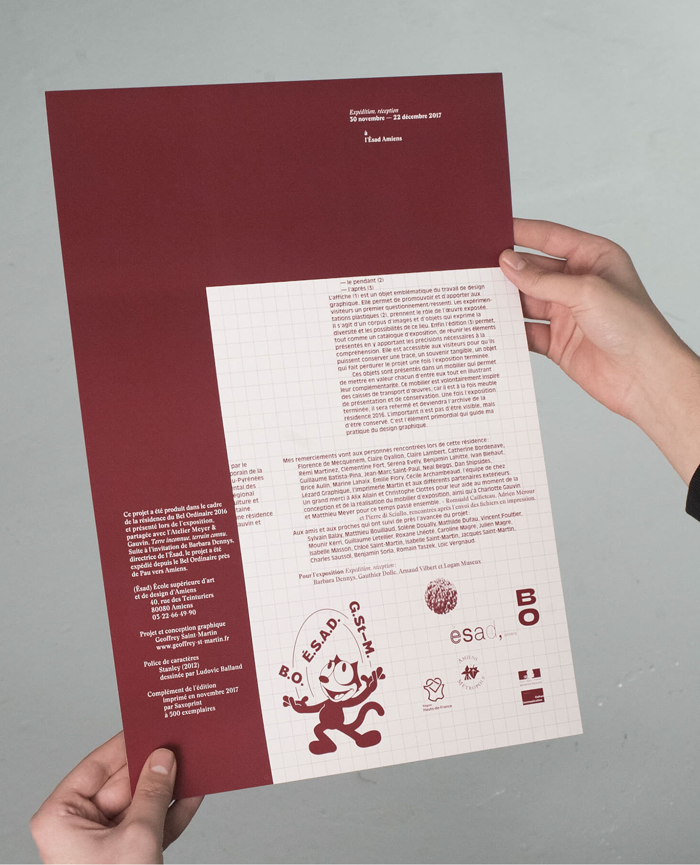 E,R3 Document Erratum, colophon de l'exposition Expédition, réception à l'ÉSAD Amiens restitution de l'exposition Terre inconnue, terrain connu offset une couleur 210 × 297 mm et 297 × 420 mm 2017