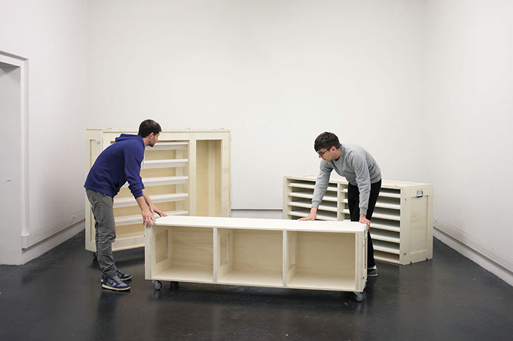 BO2 Mobilier de l’exposition Terre inconnue, terrain connu restitution d’une résidence au Bel Ordinaire, une exposition partagée avec Système Sensible (Charlotte Gauvin & Matthieu Meyer) bois aggloméré caisse no 1 1430(h) × 1900(l) × 330(p) mm, caisse no 2 830(h) × 1900(l) × 530(p) mm, caisse no 3 600(h) × 1900(l) × 530(p) mm 2016